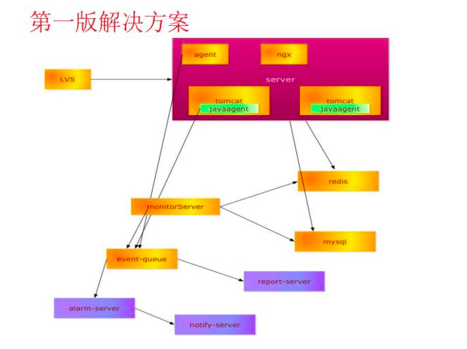 我们在 server 端开发了一个 agent 功能,对 java 产品的日志做一些采集,采集完之后丢到后端里面去。与 APP应用服务器部署在一块。 MonitorServer 主要用于监控系统级软件,通过 MonitorServer 定期去交互,取一些数据丢到队列里面。