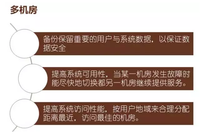 单机房死机,断电、维护无法挽回整个数据,想离线读取等都不行。当一个机房不可用,所有的业务都不可用。我们要求业务离用户很近,南方的用户连南方的机房,北方的用户连北方的机房,国外的用户连国外的机房。大陆的网络和国外的网络有一定的隔离性,如果没有做多机房的连通性,数据的传输和实时性就会有问题。