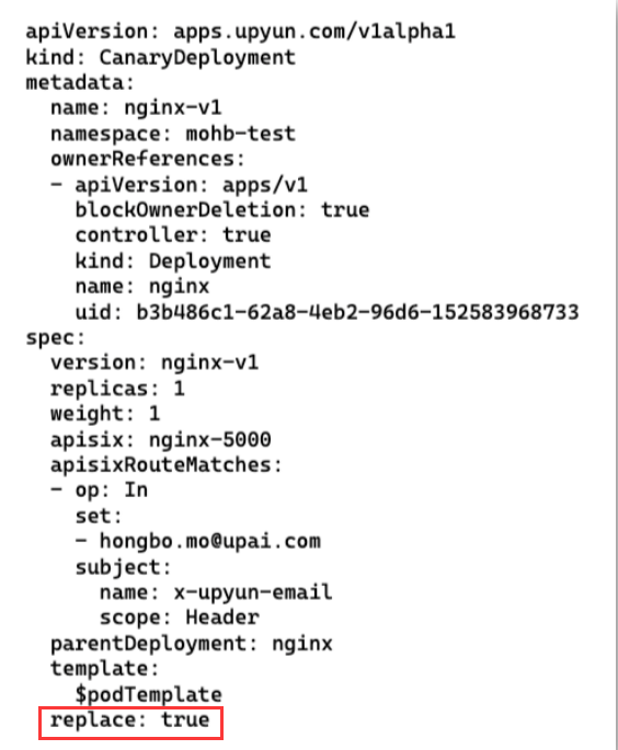 我通过加入字段 replace 进行控制,默认情况下它是 false,如果值是 true 那控制器就会知道要用 deployment 的进行替换。这里有个问题是什么时候进行替换?也就是什么时候把流量切过去。虽然直接切也可以,但是等原服务完全运行起来后再切无疑是更好的。