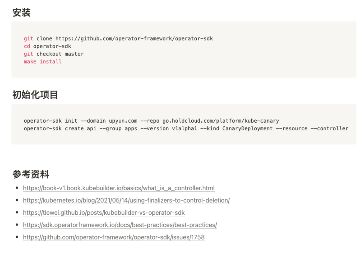 全部封装完成后需要把这些东西串起来,当前主流的选择有两个,OperatorSDK 和 Kubebuilder。
