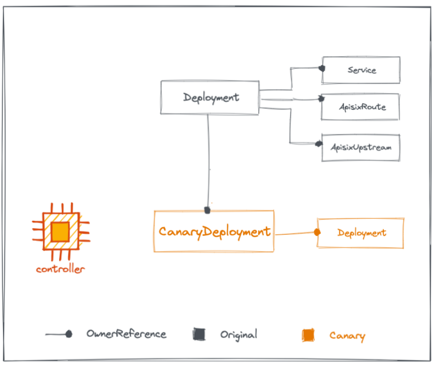 这样当删除原服务的时候,owner 会负责删除灰度服务。而删除 CanaryDeployment的时候,只会删除它右边的 Deployment。