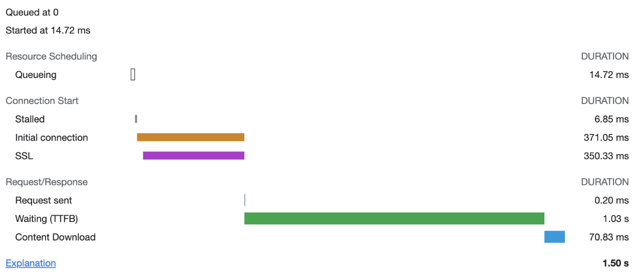 - Initial connection(初始连接):浏览器建立连接,包括 tcp 三次握手、重试以及协商 SSL。图中的紫色部分,就代表了在初始连接过程中的 SSL 协商部分。